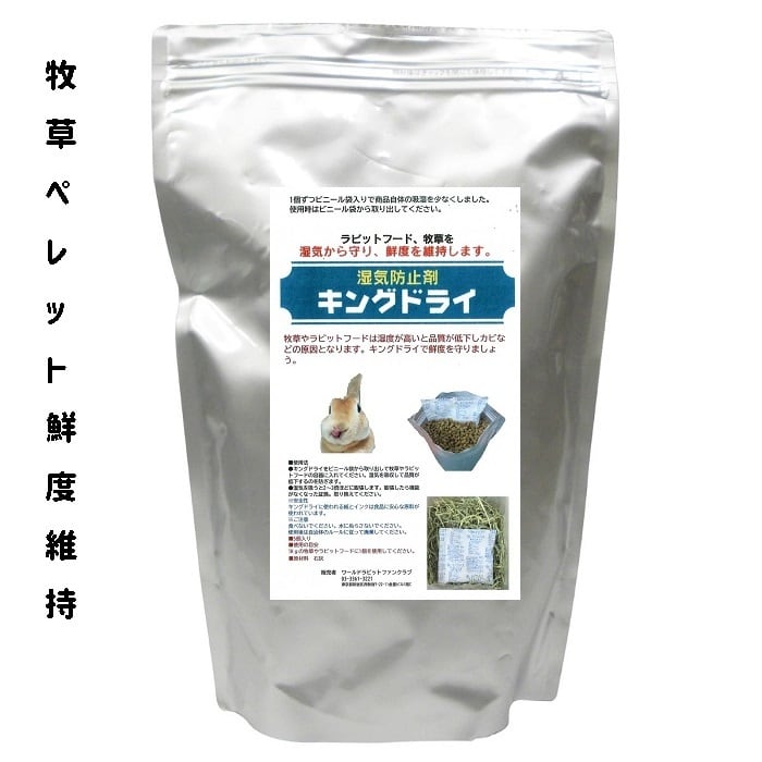 ●使用法キングドライを牧草やラビットフードの容器に入れてください。湿気を吸収して品質が劣化するのを防ぎます。湿気を吸うと2〜3倍ほどに膨張します。膨張したら機能がなくなった証拠。取り換えてください。