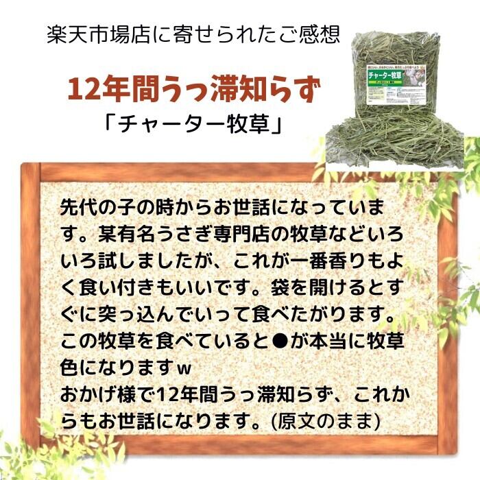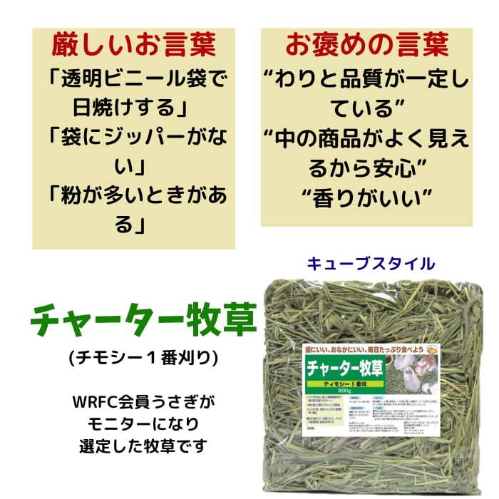 うさぎファンクラブのチャーター牧草はこの比較テストで選定されました。</p><p>